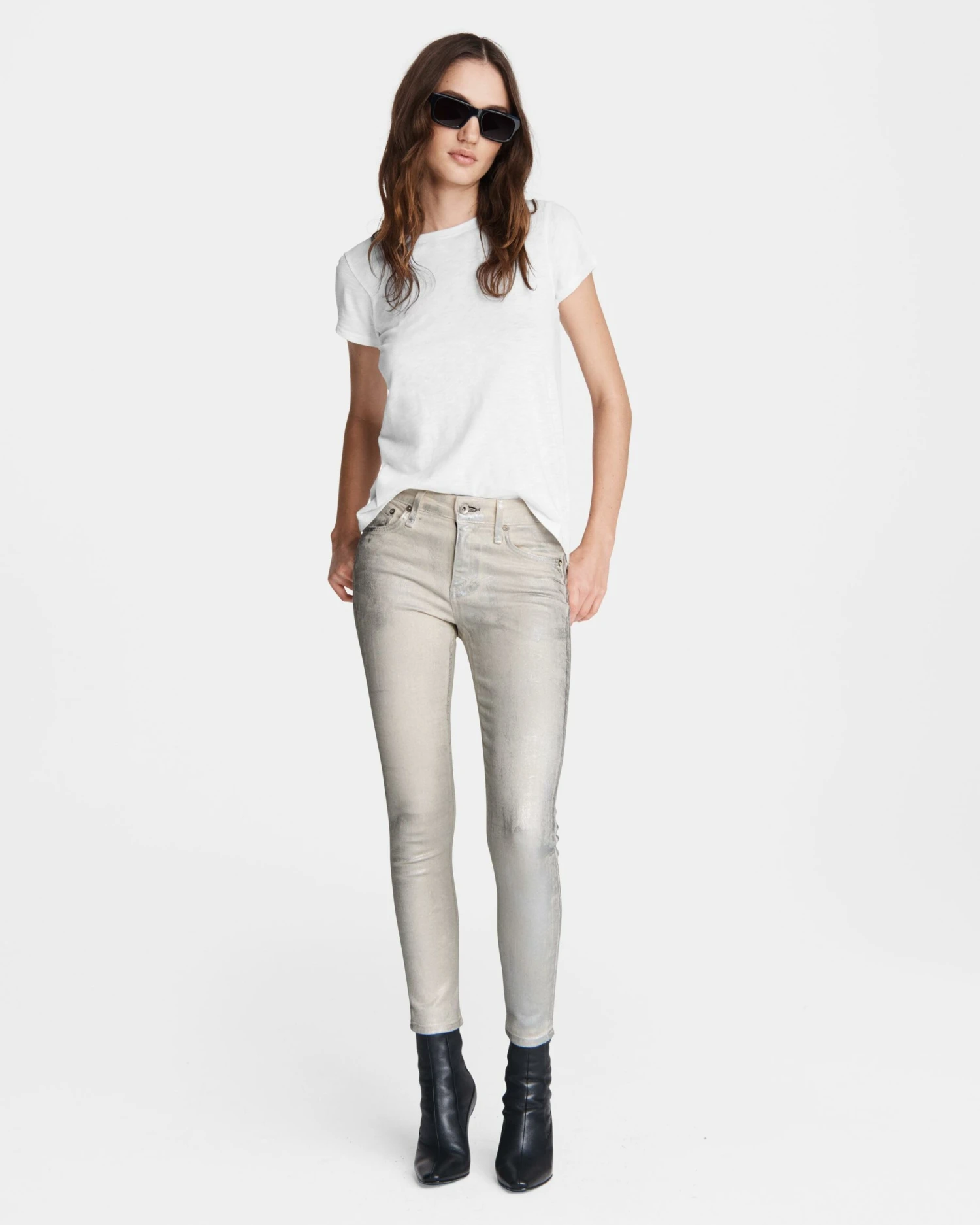 Our iconic Cate: a perfected mid-rise silhouette. Sitting at the natural waist, The Cate Mid-Rise Ankle Skinny is slim through the hip and thigh with a skinny leg and ideal ankle crop. Moonshine is a white Italian fabric, finished with silver foil. Features a zip fly.