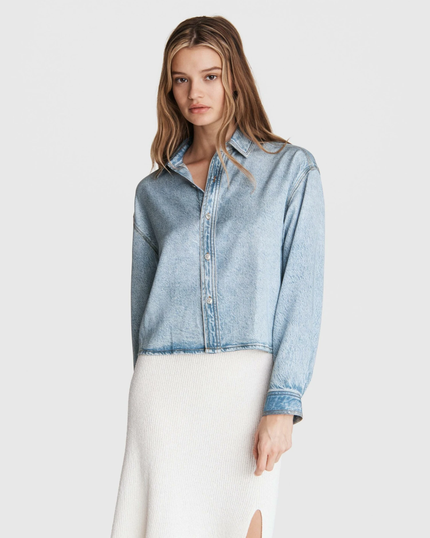 Meet Charlie, a cropped button down made in a silk-like, ultra drape-y, super soft material that looks like denim, but feels nothing like it.