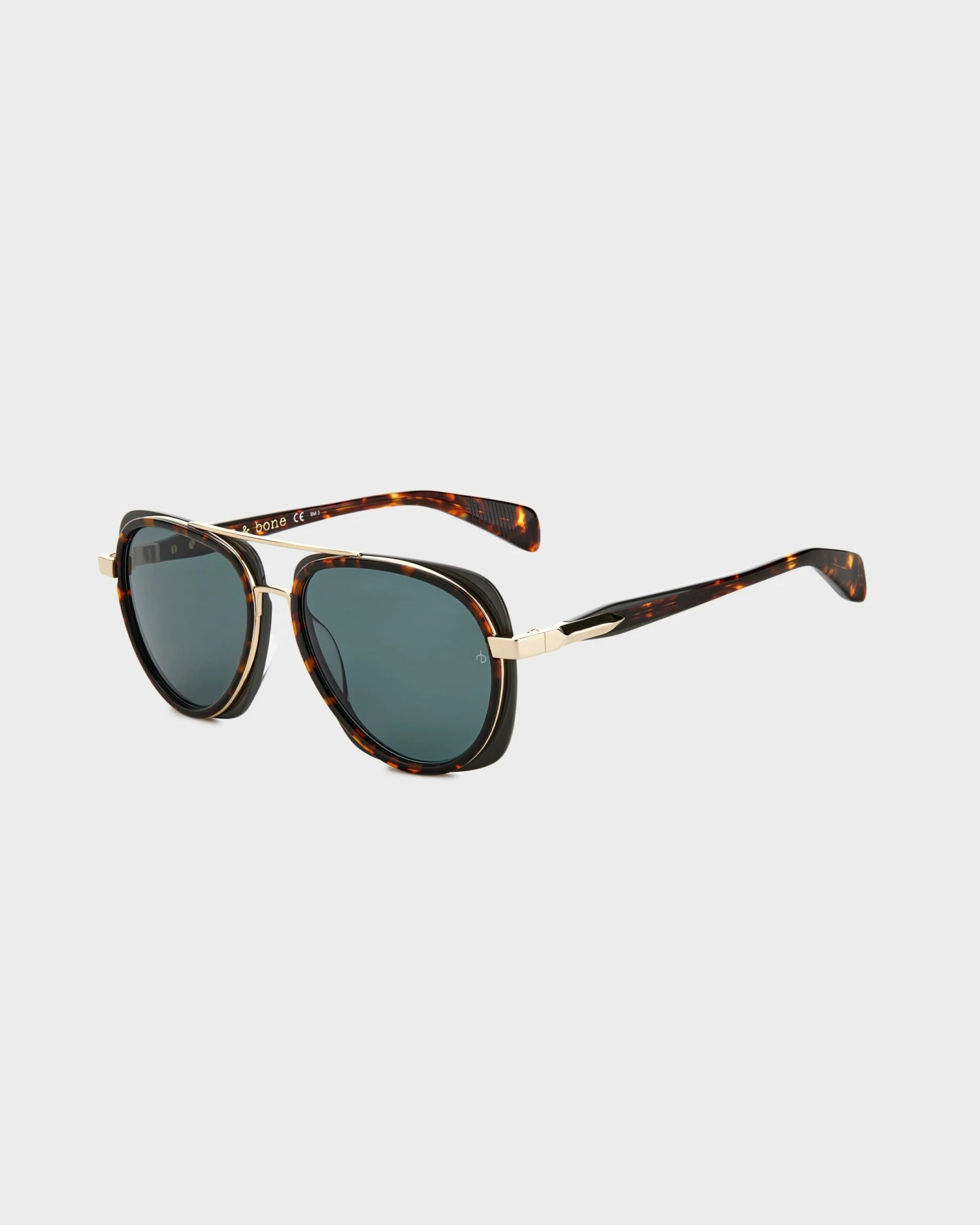 An aviator silhouette with an acetate/metal frame and 100% UV protection.