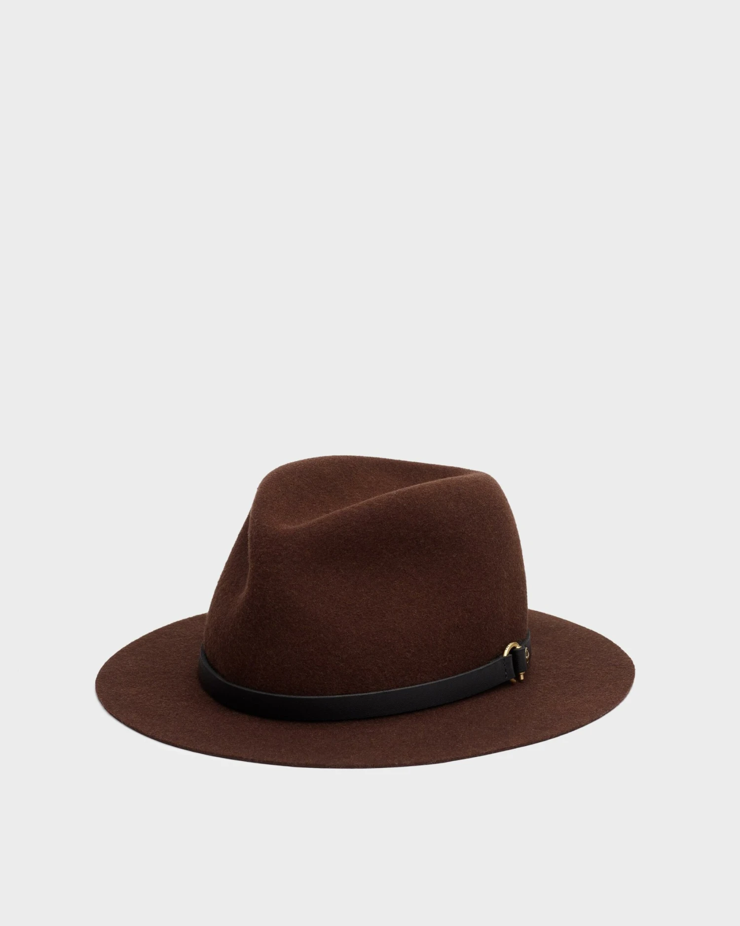 A lightweight, floppy wool hat, finished with a classic leather band, rollable with a leather strap and d-ring hook closure for easy packing.