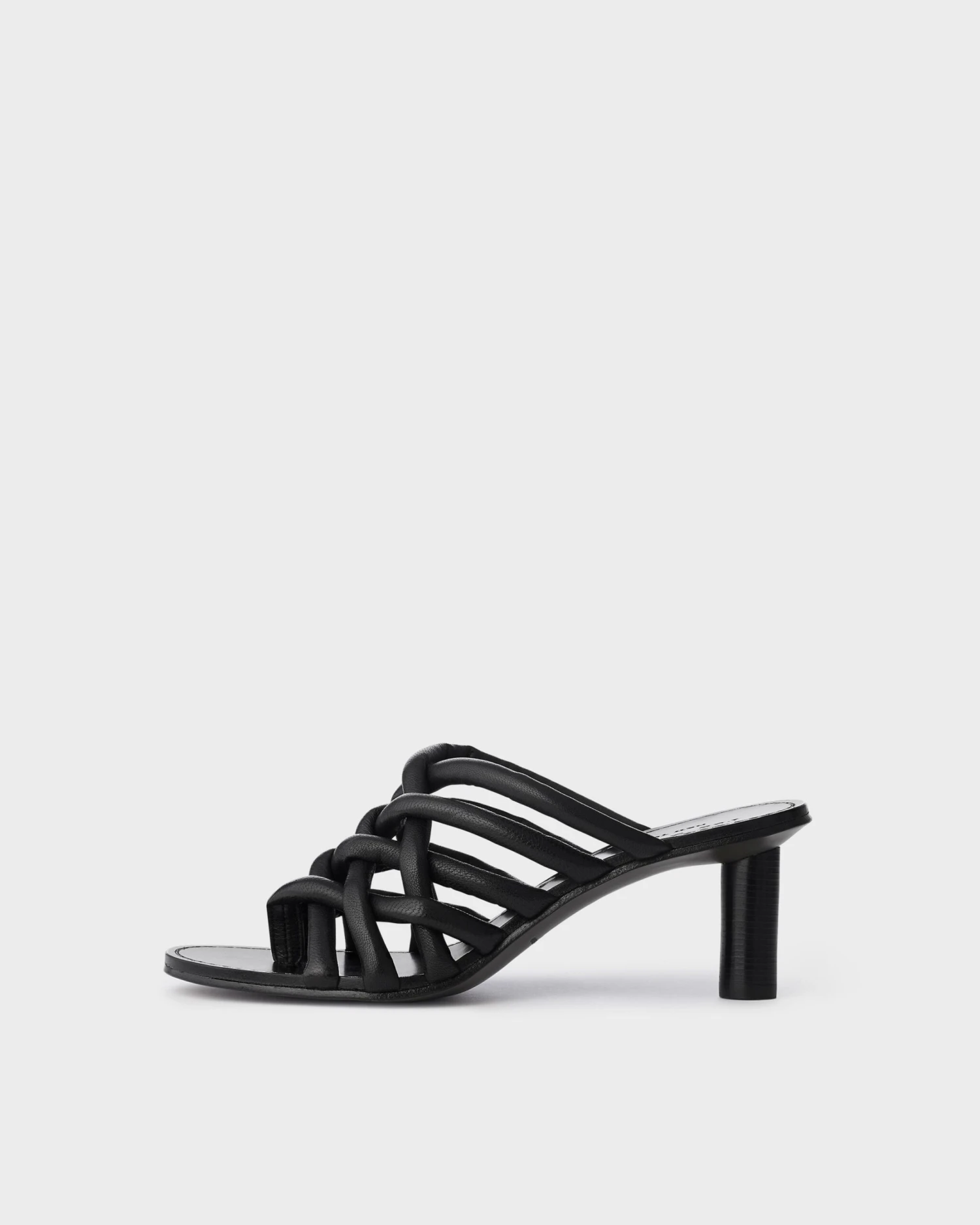 Combining delicate leather straps with a slim mule sole, this heeled sandal goes with just about anything. Features a leather footbed and rounded toe with micro-stacked wood heel finished in leather.