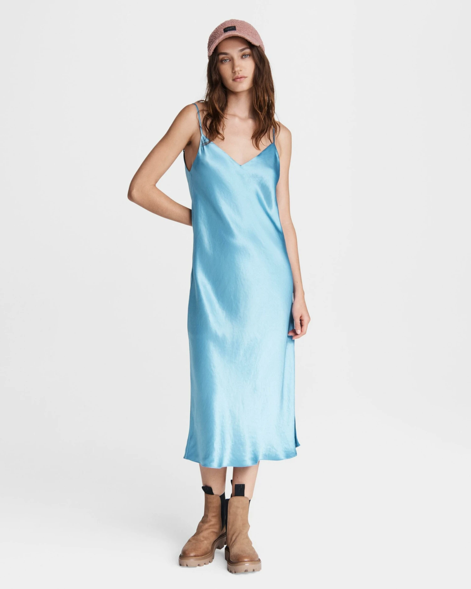 Slip into the holiday season with Mallory, the perfected slip dress. With adjustable thin straps, a wide-v neckline, and an asymmetrical hem, it’s the ultimate unexpectedly minimal statement making dress of the year.