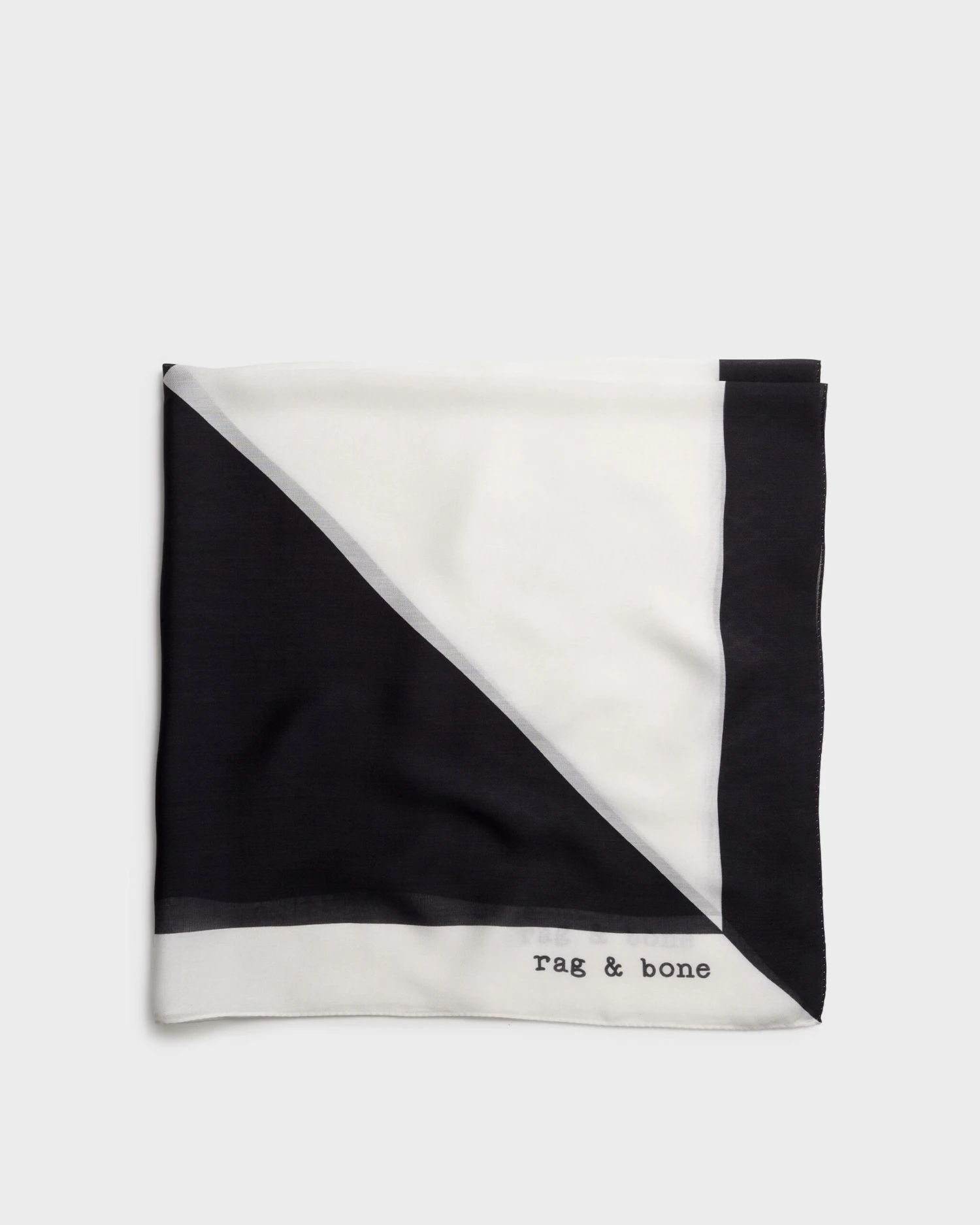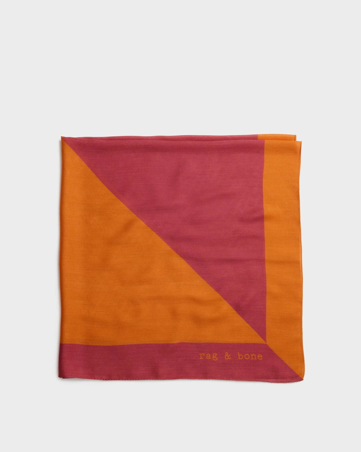 A summer-y, versatile silk scarf with a geometric color blocked design and border at the edges. Your lightweight and breathable go-to sunny accessory.