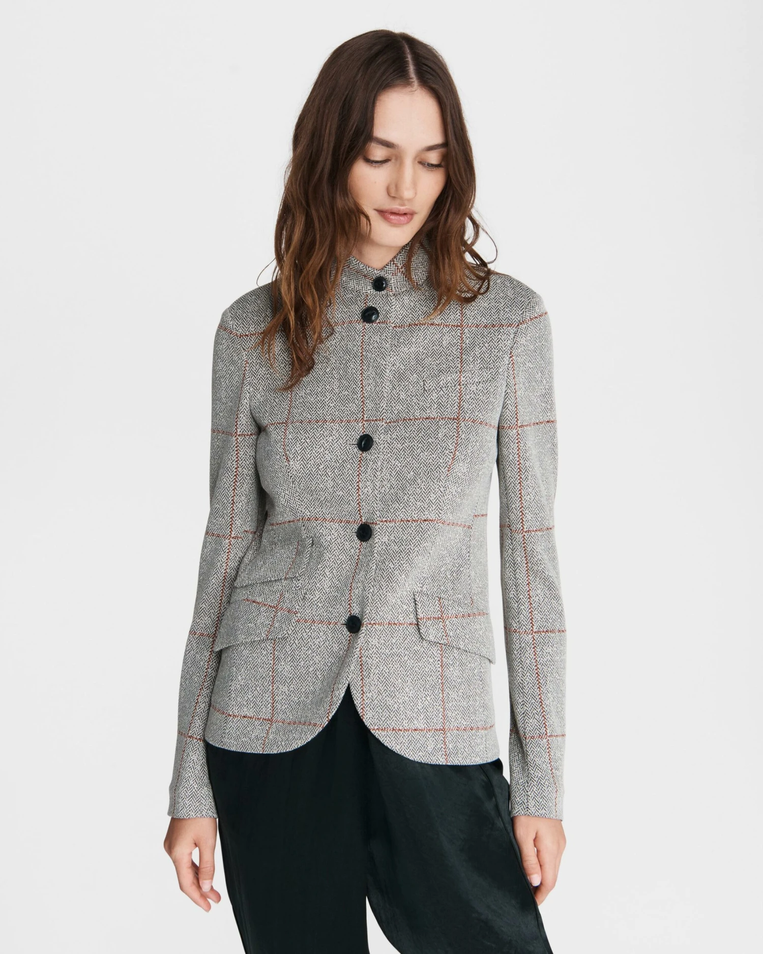 A tailored, slim fit blazer in a black and white check with a stand up collar.