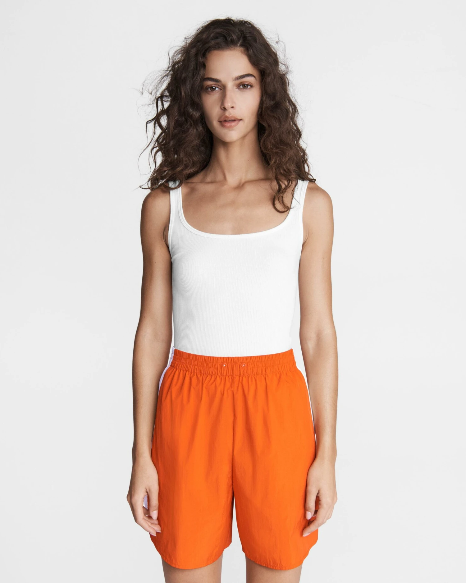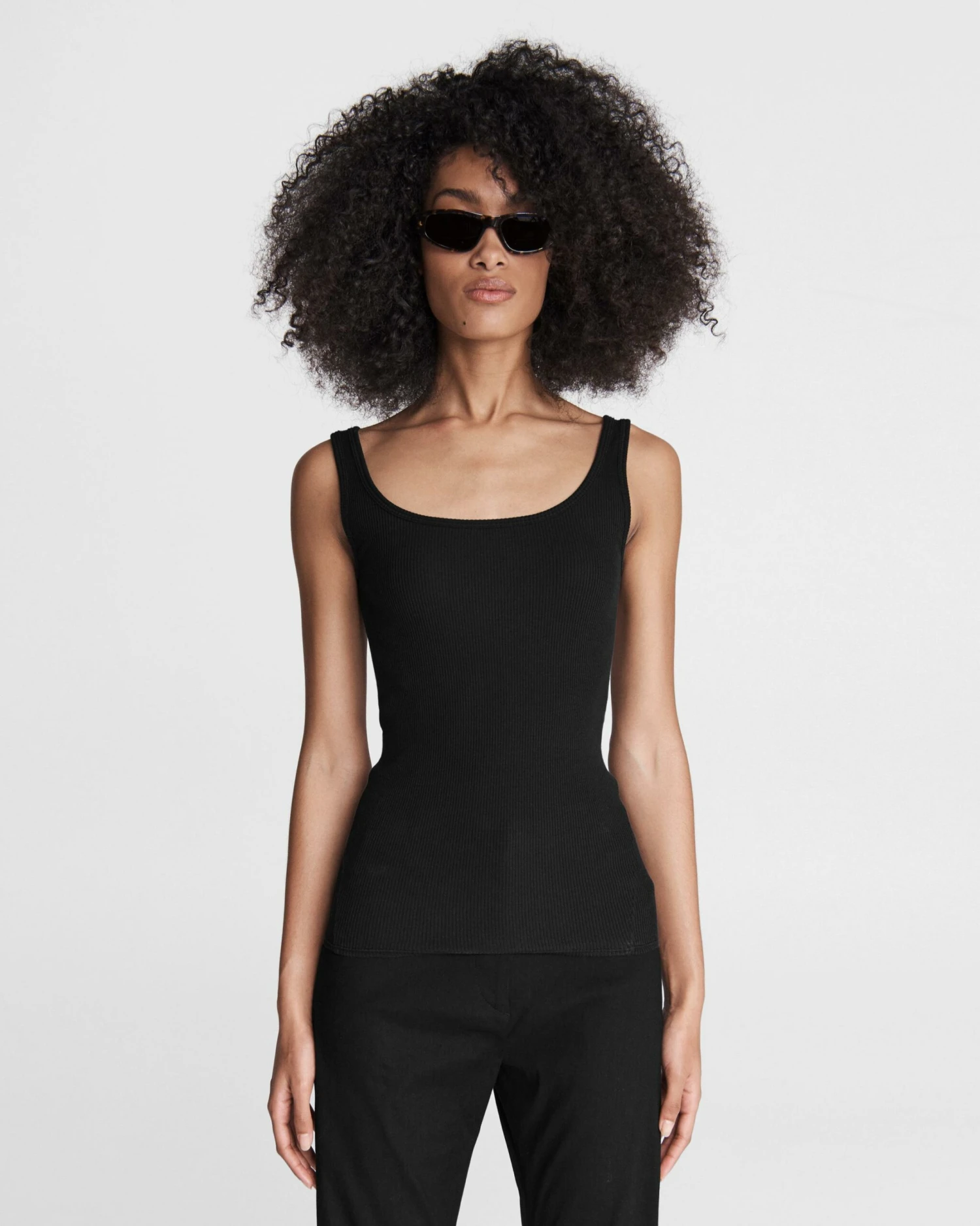 By definition you can’t live without this rib tank. Cut in an ultra flattering slim fit with a scoop neck and knit from organic-in-conversion cotton with an added touch of stretch to move around in. Essential.