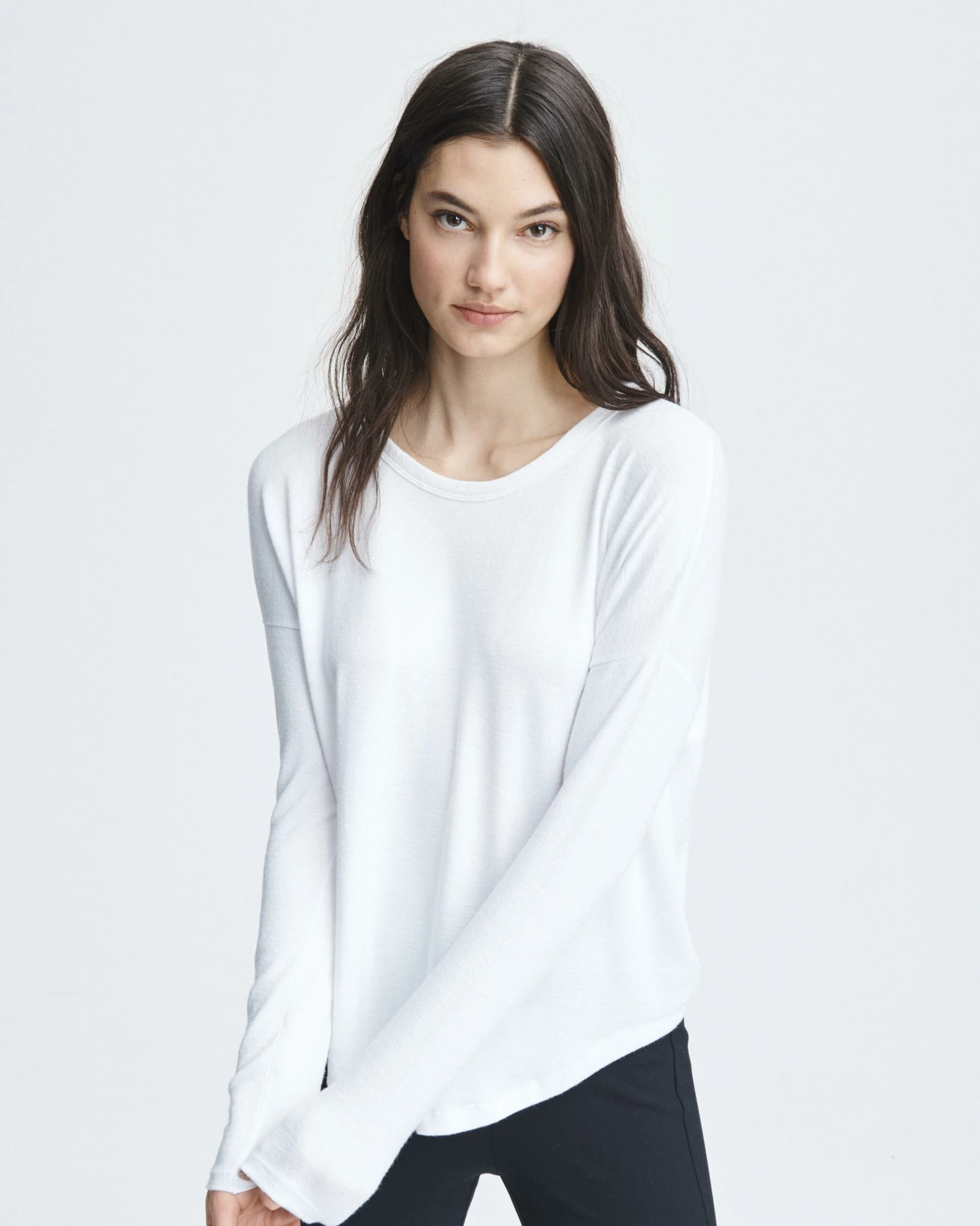 Long sleeved relaxed fit tee made from our signature jersey, a modern fabrication with incredible drape and softness. The fabric also has varying thickness in its threads which create rich highs and lows of color and a unique handmade feel.