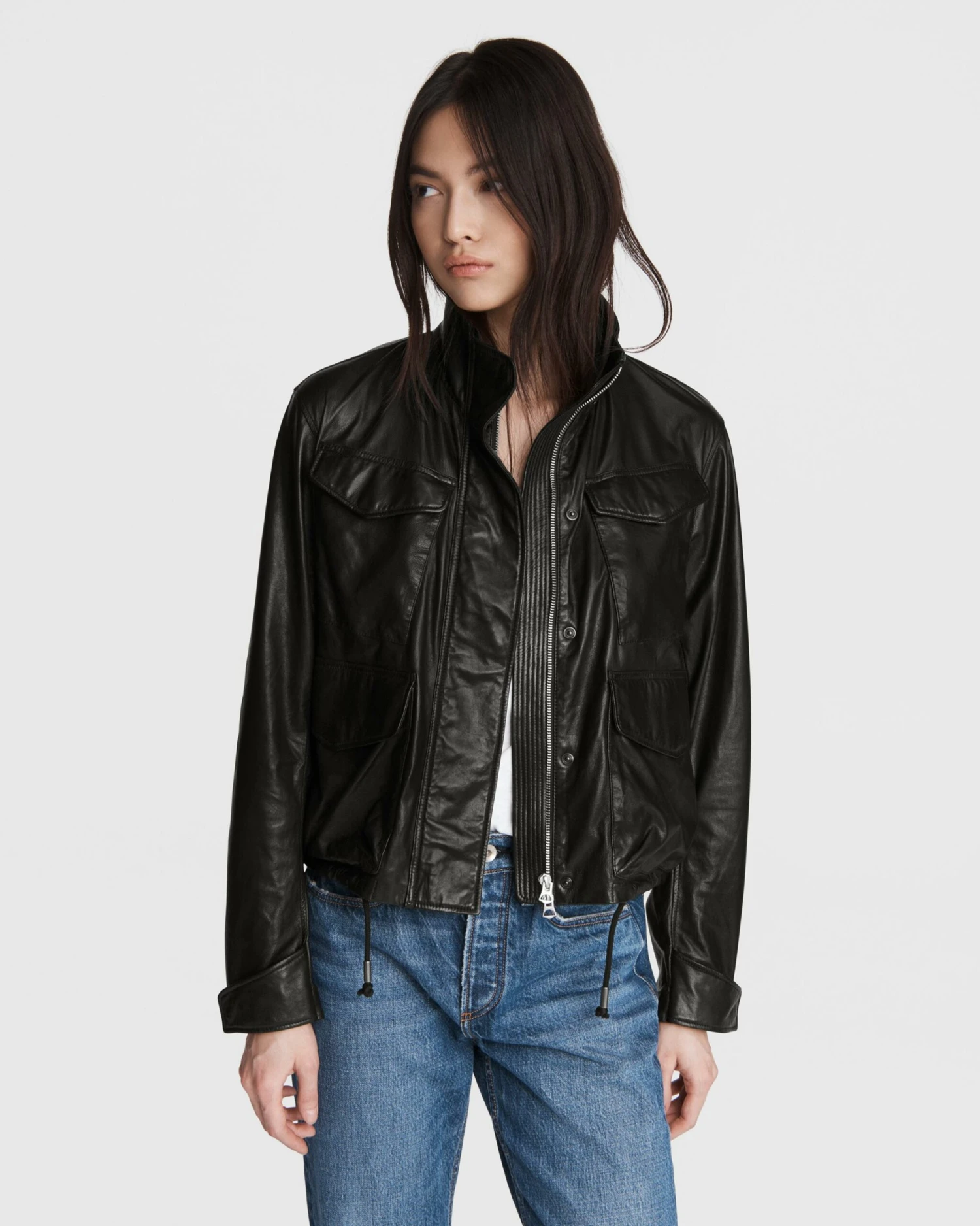 We took this season’s trail jacket and gave it an edge. Made from hand-waxed lamb leather with a cropped fit, multiple pockets, and a high neckline. Signature prym snaps and a drawcord with metal tips.