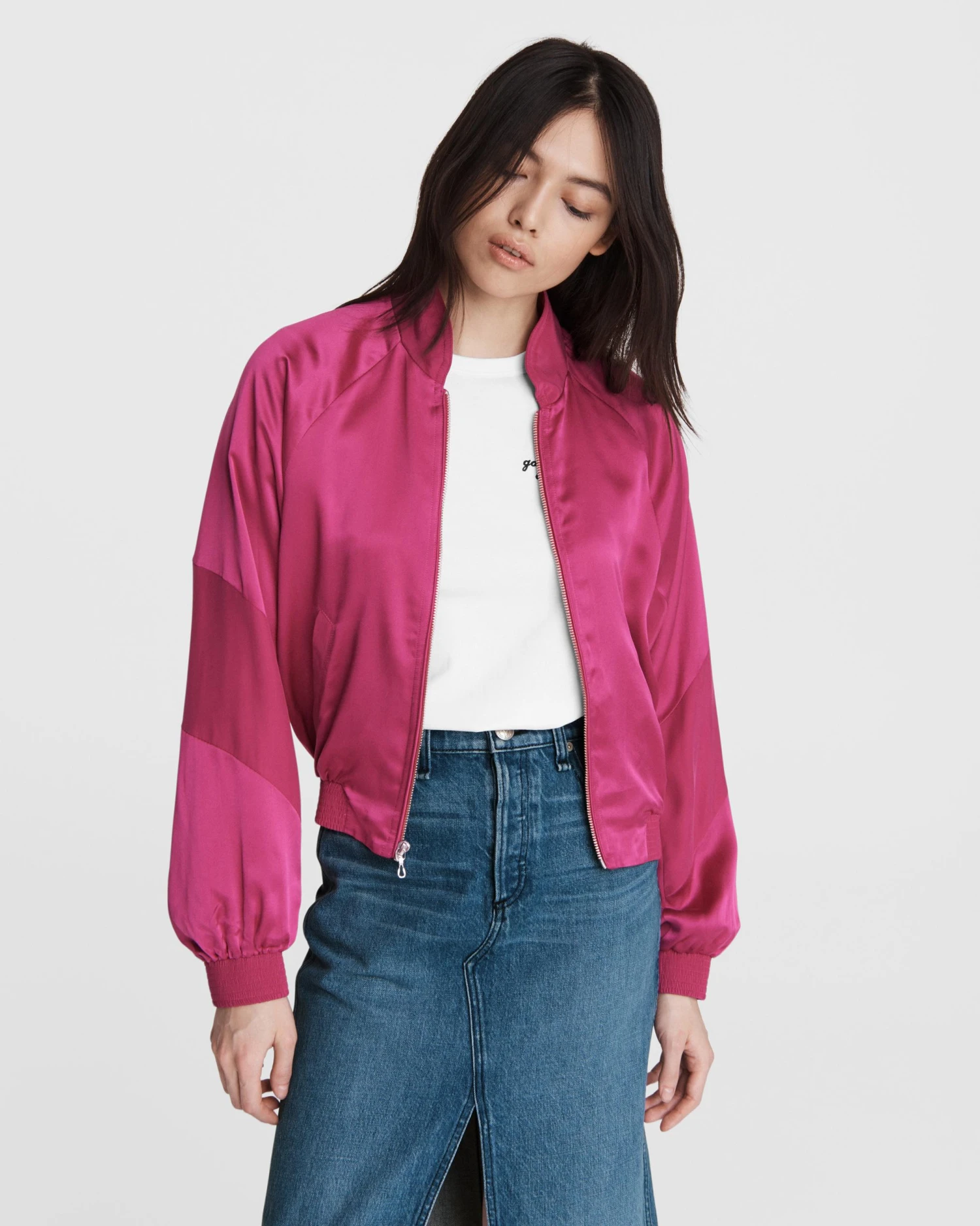 A track jacket, but better. Made from 100% silk for an elevated look and feel. Elastic hem and cuff with zip front closure.