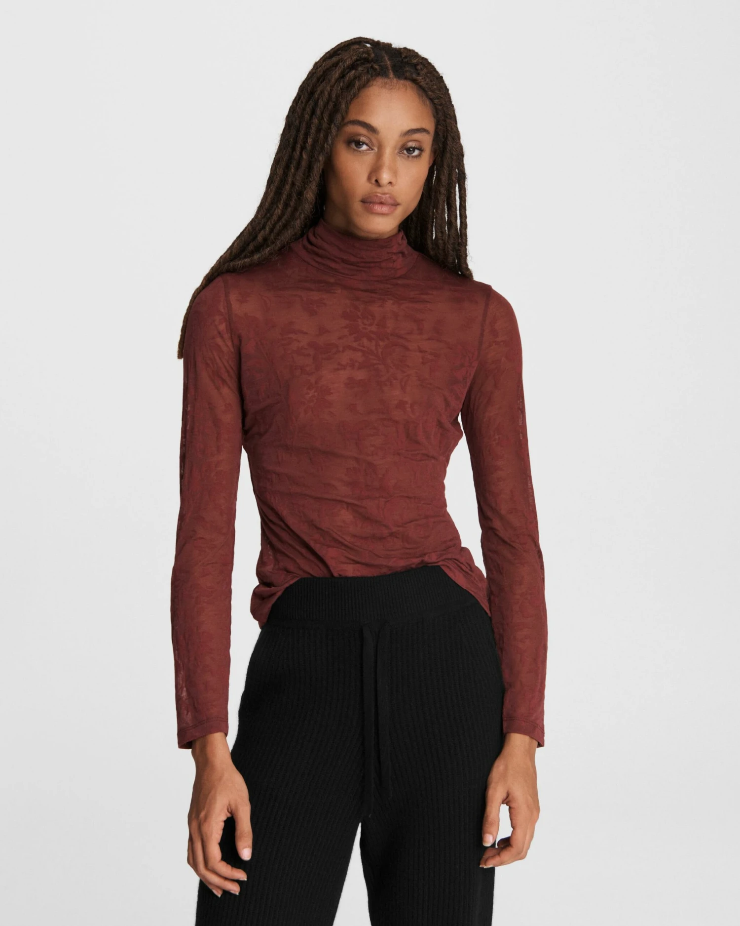 A sheer t-neck with long sleeves and a slim fit in a floral print. Crafted from our signature burnout jersey, with a touch of stretch.