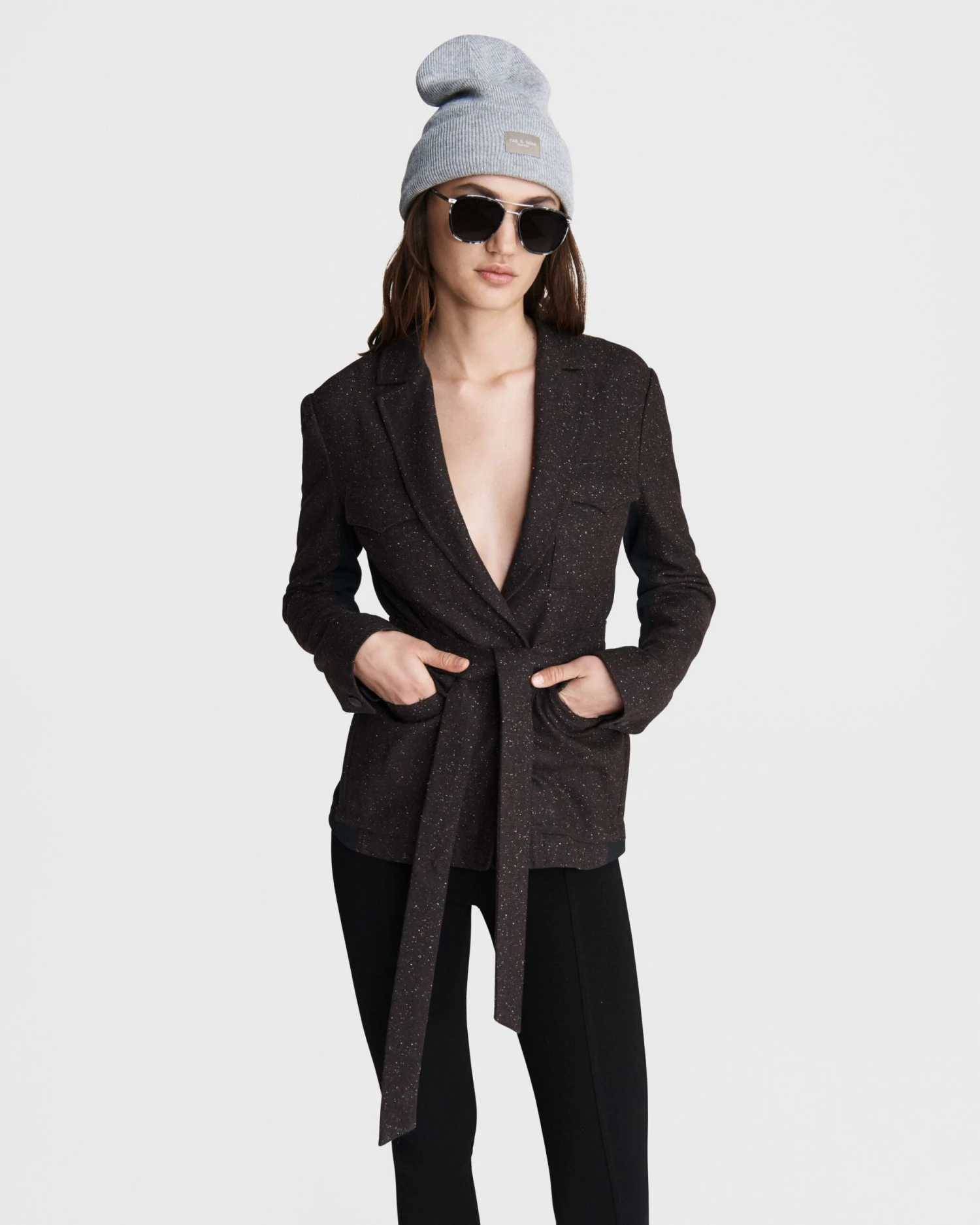 A classic blazer in a wool blend fabric, featuring a waist belt for a slimmer fit.