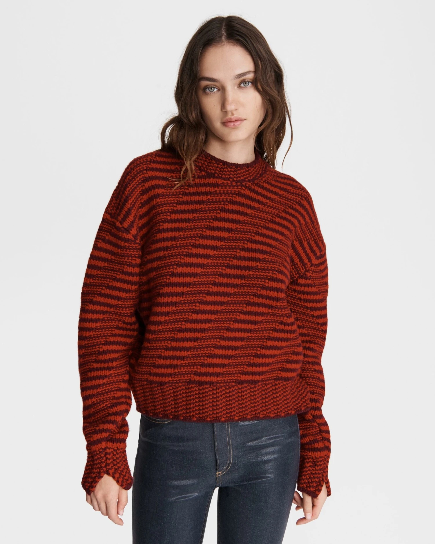 Crafted from 100% merino wool, this heritage knit sweater is done in a novelty stripe stitch with a relaxed fit.